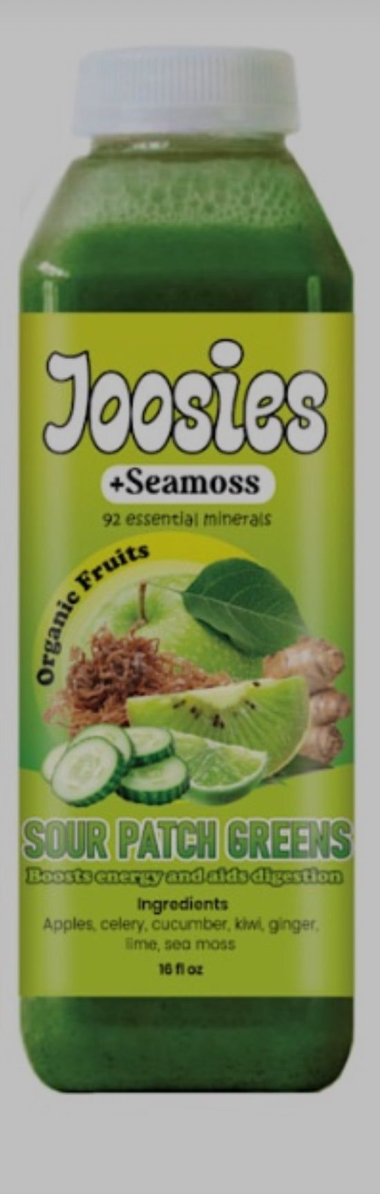 Crisp, vibrant, and deeply cleansing, Sour Patch Greens is crafted to energize the body while supporting natural detoxification. This mineral-rich green blend helps flush toxins, reduce inflammation, and promote digestive balance. Celery and cucumber support hydration and gut health, while apple and kiwi provide natural enzymes and vitamin C for sustained energy. Ginger aids digestion and circulation, and cilantro supports gentle cleansing of the body. Infused with Seamoss, this juice delivers essential minerals to nourish cells and support overall vitality.